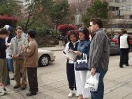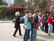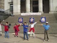 这一天春风轻拂,阳光明媚,上街的人特别多。艺术馆广场两边摆放了介绍法轮功真象的中英文展板,学员们轮流在广场中间炼功,并在街道两边发传单、征签,向过往行人讲真象。