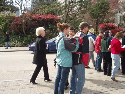 许多学员都感到人们现在对法轮功及在中国发生的迫害越来越关注。观看展板、观看学员炼功的人络绎不绝。短短几个小时,就征得1500多人在支持张昆仑起诉江泽民的明信片或征签表上签名;还不断有人询问何处可以学功。