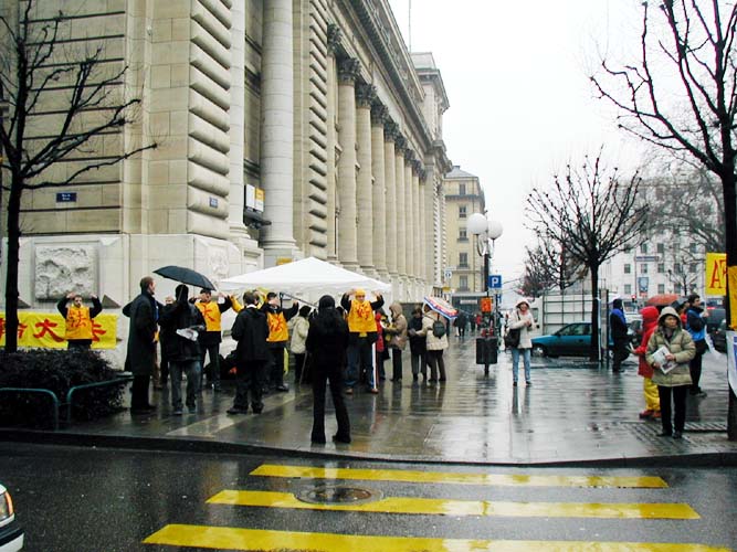 在当晚正式演出之前,他们自告奋勇走上街头,为日内瓦市民、各国游客表演,传达无数法轮功学员的心声。尽管日内瓦街头春雨纷纷,却丝毫挡不住他们的兴致,只要看到他们那认真、专注的表情,听到他们那忘我的歌声,就会感觉到他们是在用心在表演的。