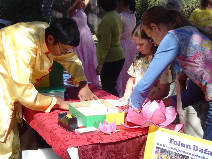 法轮大法的展位也格外引人注目。展位前,有的学员向人们介绍法轮大法的历史,弘传世界各地的情况和现在正在遭受江氏集团的残酷的真相,有的学员在教做功法,还有的学员则在教孩子们叠纸莲花。学员们良好的精神风貌和的努力让越来越多的人了解了法轮大法的殊胜美好。