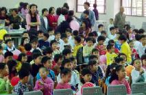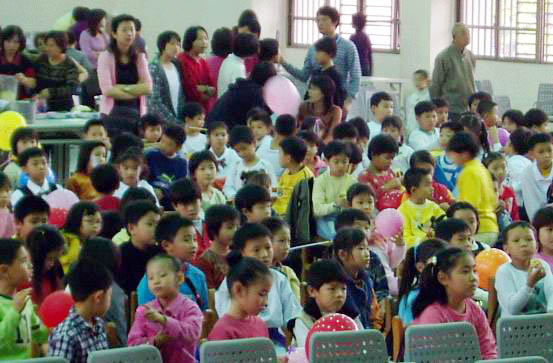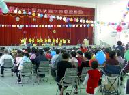 | 正法之路图片展 | 小朋友拿着印有「法轮大法好」的气球,欣赏介绍大法的节目 | 虎尾安庆国小日常学法炼功照片展 |