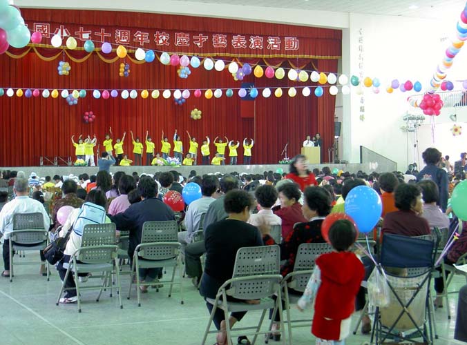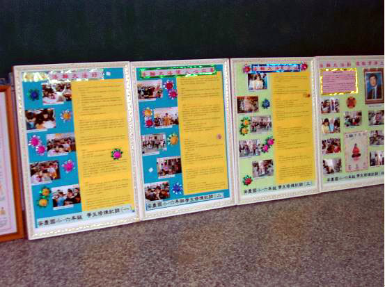 校庆系列活动中静态的艺文表演被安排在学校活动中心,门口悬挂着显眼的「法轮大法洪传世界60多国」字样的横幅,场内展示着修炼法轮功的学生的擦画作品、活动照片、法轮大法正法图片展及修炼心得体会。会场也分送了许多简介、真象资料及印有「法轮大法好、世界需要真善忍」的汽球。有的家长带着正在牙牙学语的小朋友,在一旁教导孩子学念着汽球上的「法轮大法好」。而一片球海为会场增添不少欢乐的气氛。云林县教育局长官及督学视察看后,对学炼法轮功后的学生身心向善的改变,也惊讶而赞叹不已。