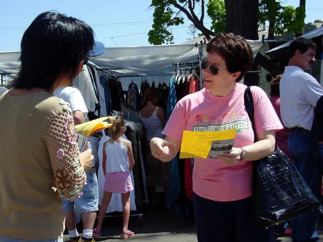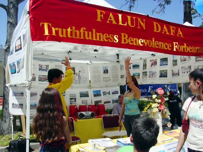 除了向游人讲清真象外,一位学员还花了近三个小时的时间走访每一位参展的摊主,并把大法简介资料送到他们的手上。每位摊主都愉快地接受了大法的资料,耐心倾听学员讲真象,并对我们义务教功之举表示了赞赏和惊讶。我们隔壁的一个摊主还邀请我们在暑假到他们的活动中心教授法轮功。除了向参展的摊主介绍大法和讲清真象外,学员还力所能及地帮助他们临时照顾摊位,接待顾客,拆卸帐篷等,所以他们都感到法轮功学员很亲切,从而使得讲清真象的效果也特别好。