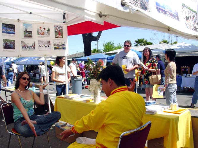 罗兰多街市节是当地社区的一个重要活动,除了吸引许多当地和附近居民的参加之外,也有不少在方圆一百英里之外前来的参展者。今年是法轮功学员首次申请参加该活动。几位学员一早就来到参展地点,将展位布置得清新、整洁、祥和,大法横幅和图片都合理地安排好位置,大法书籍和资料等整齐地摆放在桌子上。此外,在全天的活动中,有两到三名学员不间断地演示五套功法或发正念,其他学员则向观众讲解和发放资料。