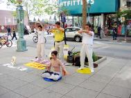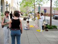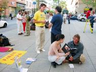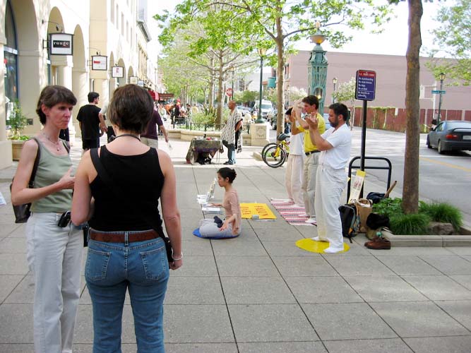 与上次有所不同的是,这次想了解真相和学功的人越来越多。我们不停的演示着法轮功的五套功法,祥和的场面吸引了人们的注意。很多路人停下来向我们了解法轮功,并询问问题,还有一些人想学习功法。一位教了太极拳30年的教师对法轮功很感兴趣,还有一位年轻人在学第五套功法时立刻就可以双盘。还有一位年轻人依依不舍,当我们离开时,他一直跟我们交谈并把我们送到停车场。