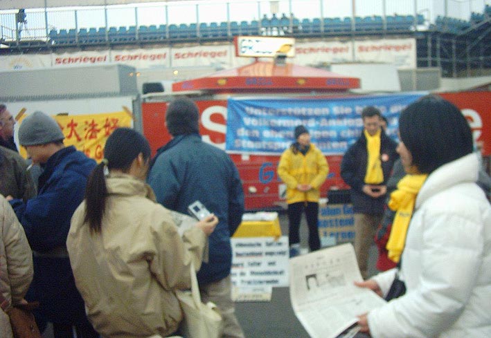 【明慧网2004年3月6日】3月3日下午,中德两国女子足球队在德国拜恩州的吕特市体育场进行比赛,来自拜恩州各地的法轮功学员在体育场入口处为来自各国的观众演示功法,散发真相资料,并打出“法轮大法好”,“法轮功学员为中国女足加油”以及“江泽民因群体灭绝罪在德国被告上法庭”的横幅,引起到场观众,尤其是中国观众的关注。很多中国观众阅读了中文真相资料,并为正在炼功的法轮功学员拍照。