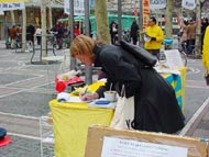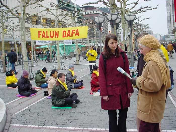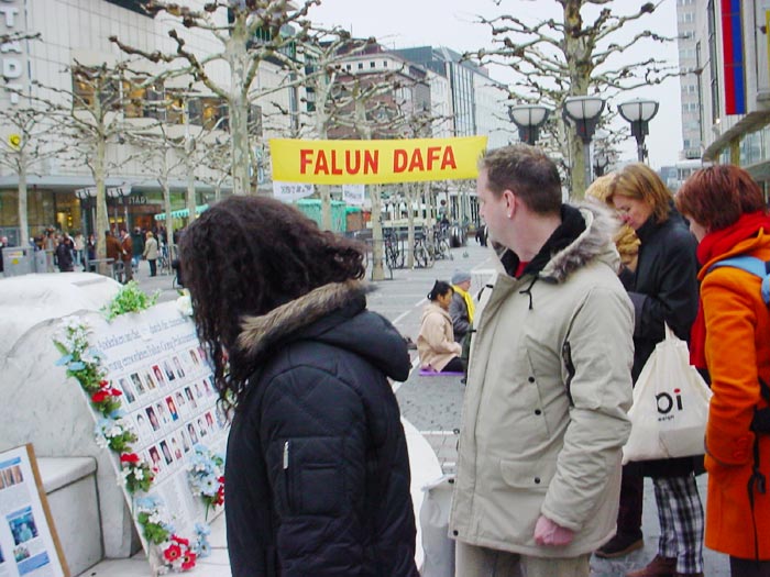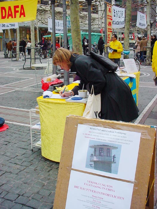 2月21日在法兰克福市中心举行了法轮功信息日。在树之间分别悬挂着四幅写有那些主犯名字的横幅。横幅前,法兰克福炼功小组展示着祥和流畅的功法,如果在中国这样做肯定是会被捕的。这个炼功小组向人们解释江泽民集团及其追随者在中国所犯的罪行。一个大型展板上清楚地展示着许多照片,那些是在这四年半内因学炼法轮功而在警察局和劳教所中被那些受国家支使的人,以非人的手段迫害、酷刑致死的人。