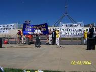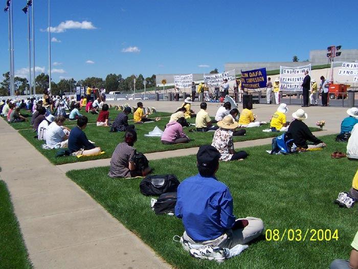 新闻发布会之后,部分法轮功学员在国会大厦前进行和平的炼功和请愿活动。安详、平和的大型集会场面震撼了在国会前的游客与行人。很多人关心地前来询问和了解关于法轮功及其学员受迫害的情况。明白了真相的人们主动签名并向法轮功学员要相关资料。整个活动在3点左右结束。部分法轮功学员又到堪培拉中国大使馆前进行和平请愿。