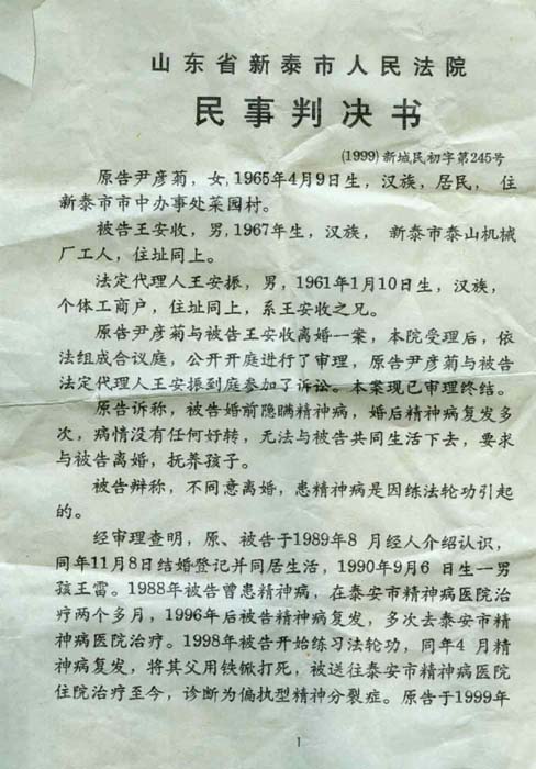 从判决书中我们可以清楚地看到,法庭调查资料确证王安收将其父亲用铁锨打死是因原精神病发作所致。在江泽民集团迫害诬蔑法轮功后,一些不法之徒为了借机捞取政治资本和个人私利,却将这一事件诬蔑为王安收将其父亲用铁锨打死是练法轮功所为,大肆造谣,毒害不明真相的百姓。在江泽民炮制的“因练法轮功导致1400人死亡”的谎言中,山东新泰市的王安收就是其中的一例。