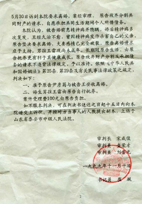 民事判决书 (1999)新城民初字第245号 原告尹彦菊,女,1965年4月9日生,汉族,居民,住新泰市市中办事处菜园村。 原告尹彦菊与被告王安收离婚一案,本院受理后,依法组成合议庭,公开开庭进行了审理,原告尹彦菊与被告法定代理人王安振到庭参加了诉论。本案现已审理终结。 原告称,被告婚前隐瞒精神病,婚后精神病复发多次,病情没有任何好转,无法与被告共同生活下去,要求与被告离婚,抚养孩子。 被告辩称,不同意离婚,患精神病是因练法轮功引起的。 经审理查明,原、被告于1989年8月经人介绍认识,同年11月8日结婚登记并同居生活,1990年9月6日生一男孩王雷。1988年被告曾患精神病,在泰安市精神病医院治疗两个多月,1996年后被告精神病复发,多次去泰安市精神病院治疗。1998年被告开始练习法轮功,同年4月精神病复发,将其父亲用铁锨打死,被送往泰安市精神病医院住院治疗至今,论断为偏执型精神分裂症。原告于1999年5月30日到本院要求离婚。案经审理,原告放弃分割共同财产的请求,自愿承担共同生活期间个人所借债务。 本院认为,被告婚前患精神病并隐瞒,婚后精神病多次复发,且经久治不愈,曾因精神病发作杀害自己的父亲,原告坚决要求离婚,夫妻感情已完全破裂,原告离婚请求予以支持。男孩子王雷现尚未成年。长期随原告生活,由原告抚养更有利于其健康成长。原告放弃财产分割及承担债务的请求不违背法律规定,予以准许。依照《中华人民共和国婚姻法》第25条、第29条及有关民事法律政策之规定,判决如下: 一、准原告尹彦菊与被告王安收离婚。 案件受理费100元由原告负担。 如不服本判决,可在判决书送达之日起十五日内向本院递交上诉状,并按对方当事人的人数提出副本,上诉于山东省泰安市中级人民法院。 审判长 宋成俊 |
