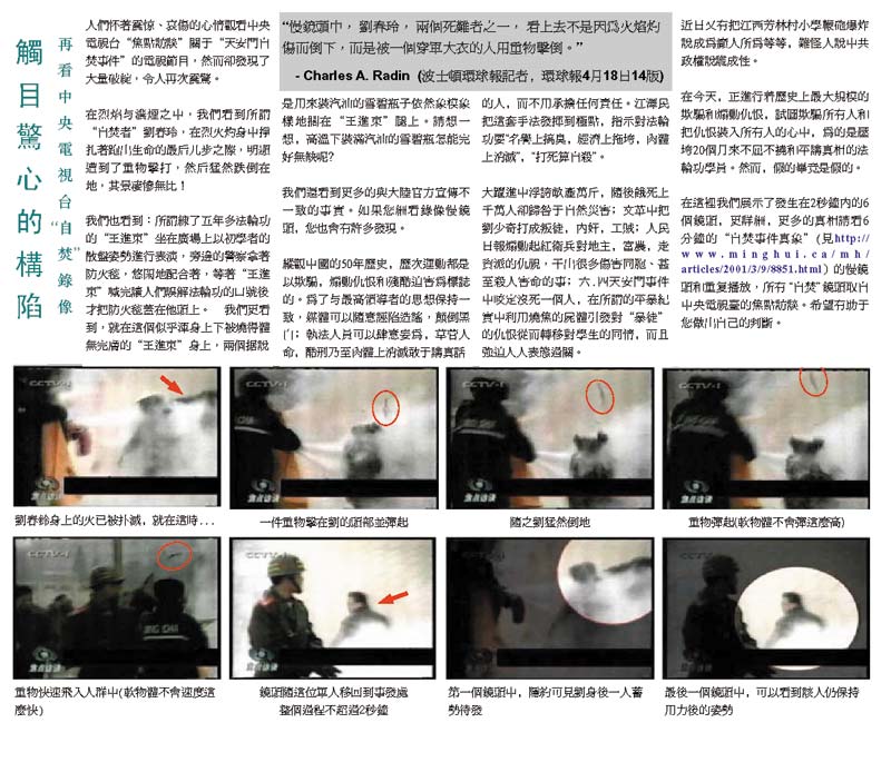 江氏集团炮制天安门“自焚”案,并且嫁祸给法轮功,影响恶劣,是江氏栽赃法轮功的最大谎言,煽动了一些不明真相的人们对法轮功产生仇恨。经过专家对中央电视台录像进行慢镜头分析发现,里面破绽百出,自焚者之一刘春玲被人从脑后面当场打死,几名自焚者根本不是法轮功学员。