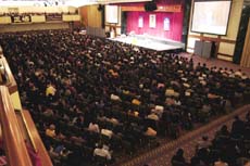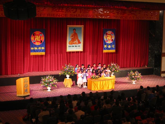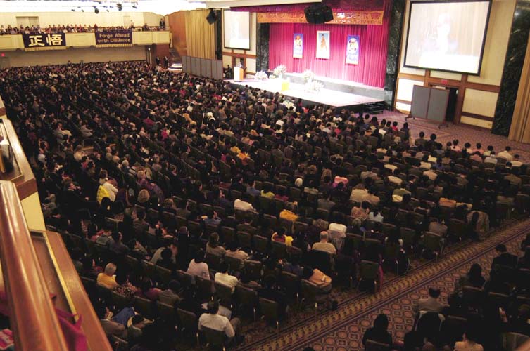 参加此次纽约修炼心得交流会的人数逾4000人,除了北美各地外,还有来自欧洲、澳洲、日本、新加坡、韩国、台湾等世界各地多个国家和地区的法轮功学员。法会现场庄严温馨,主席台外侧正上方是「法轮大法纽约修炼心得交流会」的黄色主题横幅。内侧左右悬挂着「法轮常转」和「真善忍」的法轮图,中间是师父的法像,在红色丝绒的衬托下分外醒目。主席台上精心布置的鲜花美丽饱满,芬芳四溢。主席台对面的二楼平台上是“真善忍”三个各自独立的大字,平台两侧分别悬挂着写有「正悟」和「精进」的中英文横幅。主席台两侧的大幅宽幕投影使会场舞台的可视性大大提高。