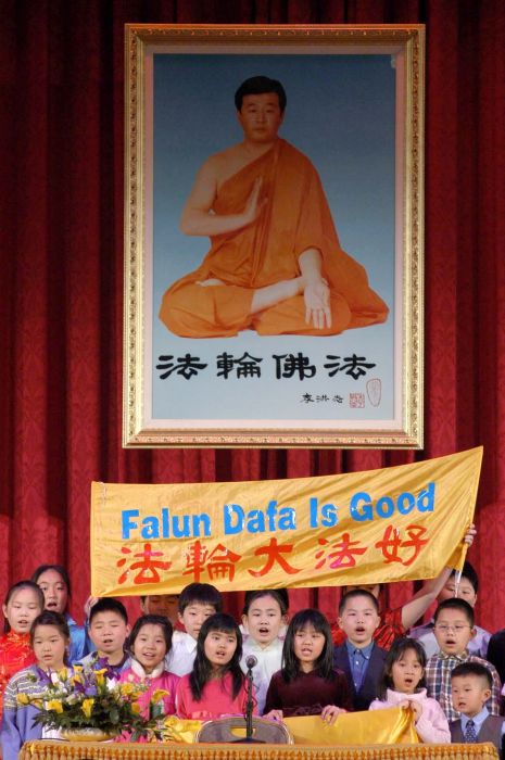 大纽约地区明慧学校的小弟子上台背诵了数首师父《洪吟》中的诗篇。背诵结束后,小弟子们打出中英文「法轮大法好」横幅,并用中、英、俄、西班牙等五种语言大声说「法轮大法好」。