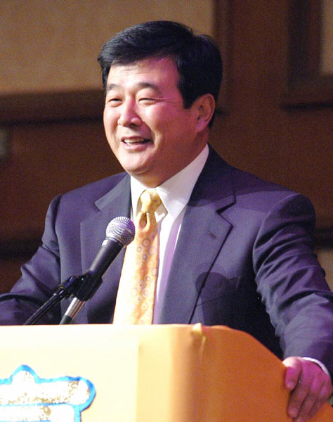 讲法结束后,全体学员起立长时间鼓掌致敬,并有一位学员向师父献花。师父在台上绕台走了一圈,频频向大家挥手。弟子们热烈的鼓掌一直到师父离开会场。