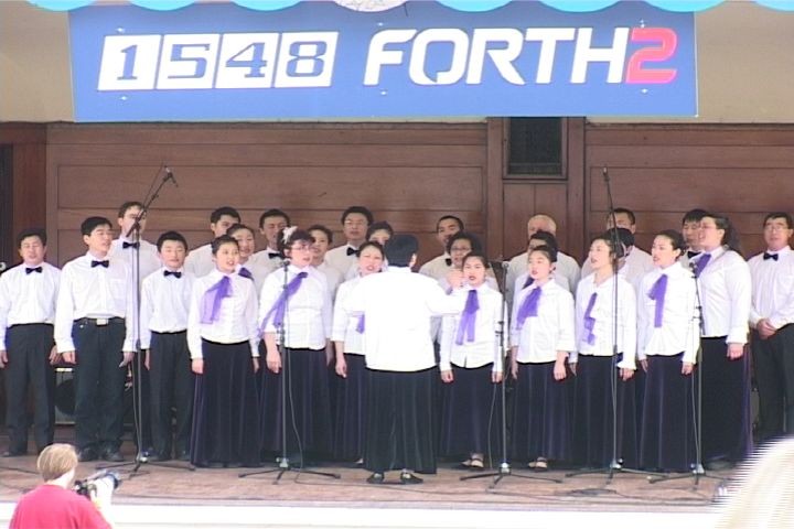 | 代表镇邪除恶的锣鼓队 | 花伞舞蹈表演 | 四声部合唱宣传大法的歌曲 |