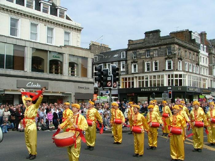 在回来的路上,游人纷纷向学员们招手致意,不时还有热情的苏格兰人打招呼问候,有的还用外国腔调的中国话对学员们说:“谢谢”。一对夫妻特意来到学员们面前祝贺说:“我认为,你们的表演是今天最美的。”当他得知法轮功学员们已连续两届获得爱丁堡国际艺术节一等奖时,他说:“你们今年也一定会获得国际艺术节的一等奖的!我们期待八月份见到你们的表演。”