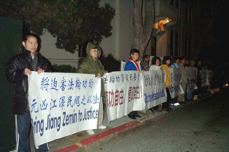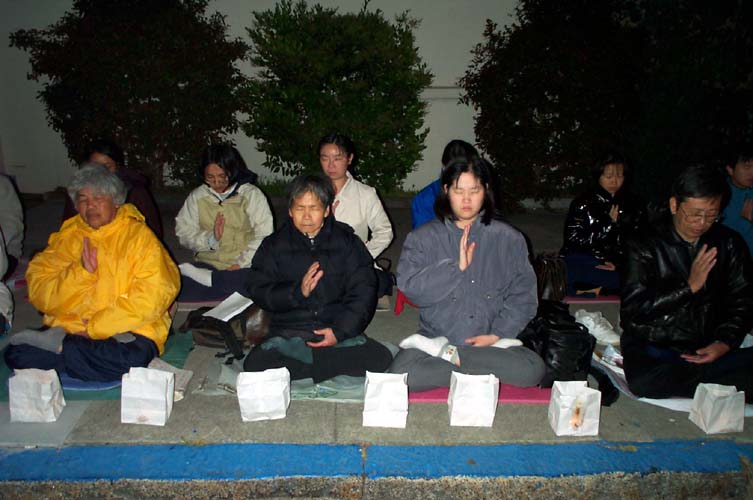 在寒风中,有的法轮功学员手里拿着“制止对法轮功的迫害”、“制止虐杀”、“法轮功学员只要求炼功自由、信仰自由”、“呼吁联合国制止中国民权迫害”的横幅静静的站着。有的打坐炼功,给来往路人展示功法。
