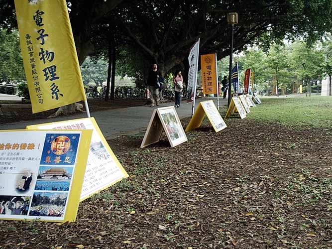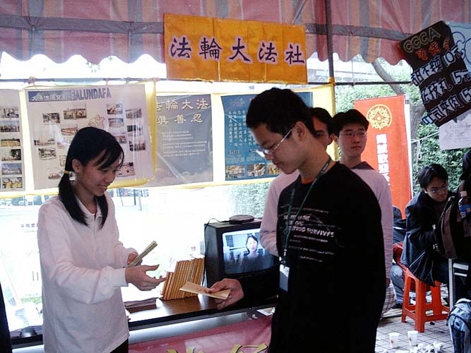 此外,为了不错过任何一个有缘人,除了在摊位附近外,法轮功学员也主动的在校园的其他角落发简介。在学校校友举办的募款餐会上有许多毕业的校友参加,他们中很多是高科技公司的高层主管,由于现在两岸的商业交流非常密集,社员们也希望他们能够更加了解法轮大法以及法轮功学员在大陆受到的人权迫害,大部分的与会者都很乐意的接下相关资料。而在演唱的舞台旁,学生们更是当场看起了法轮功简介,并且互相交换意见。