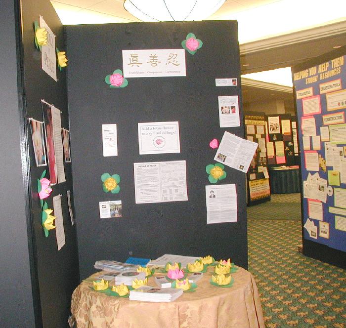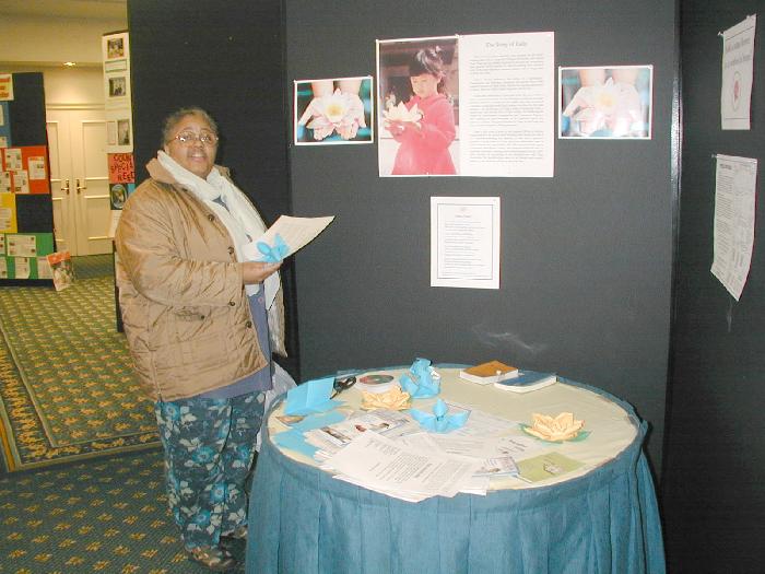 “和平花瓣”的展桌上摆满了大大小小的纸莲花,在展览会上特别引人注目。法轮功学员和展览会上许多国际大赦在全美各地的联系人进行了交谈,并把美丽的纸莲花送给参展的各位人士,有些人就直接把纸莲花别在了身上。孩子们纯洁无辜的生命牵动着人们的心,纸莲花帮助着人们对发生在中原大地上的这场血腥的镇压有了更多的了解和关注。
