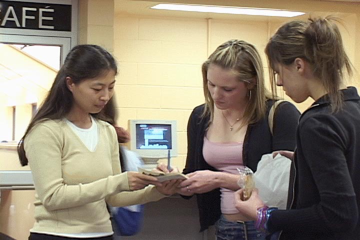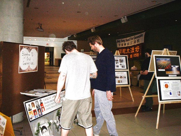 2004年3月30日中午,作为全加大学审江活动的一部分,阿伯达大学(University of Alberta)法轮功学生俱乐部在熙熙攘攘的学生联谊会大楼里举行了模拟审江活动。会场布置得庄严、肃穆,审江的条幅、江氏迫害法轮功的罪证图片、以及法轮大法弘传世界的图片吸引着在大厅内用餐和学习的师生。人们纷纷走到布置在会场一旁的小桌上签名,表示对审江活动的支持。