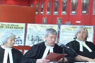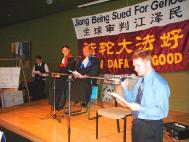 | 模拟法庭现场 | 酷刑受害者张昆仑向卡尔顿大学学生演讲 | 学生在支持诉江的请愿信上签名 |