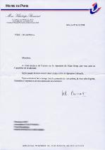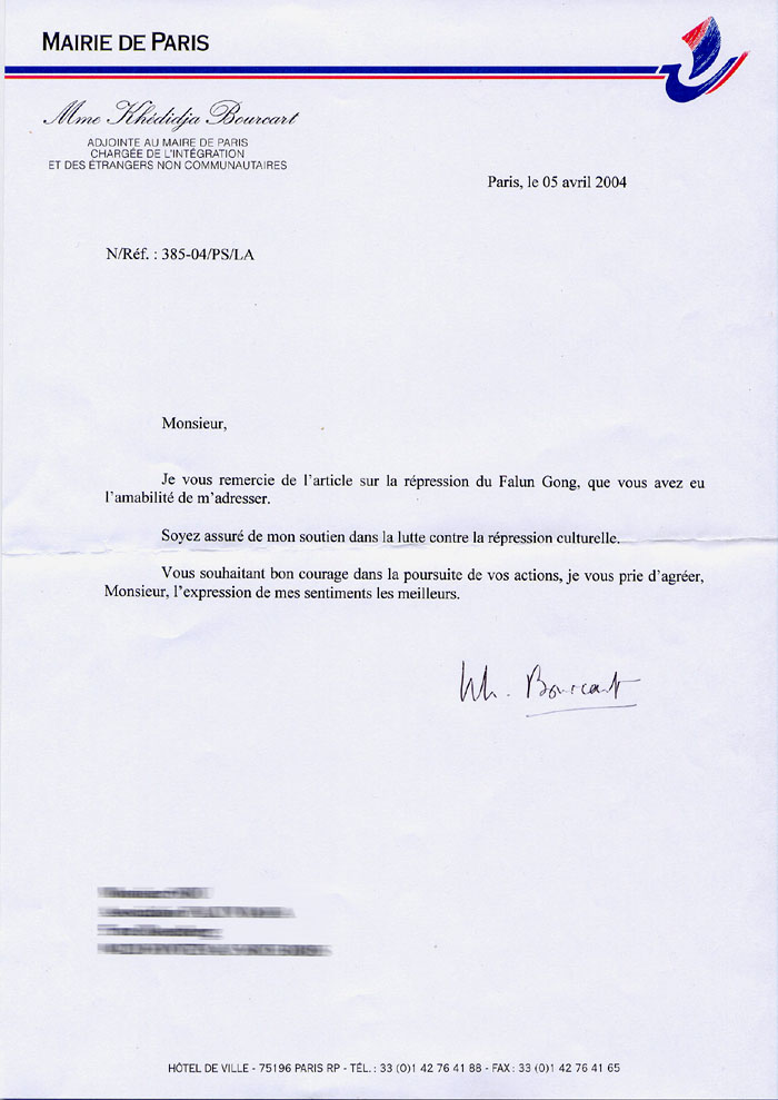 【明慧网2004年4月20日】2004年1月,在残酷迫害法轮功的江氏集团的欺骗与压力下,不明真象的法国警察在巴黎对法轮功学员进行了骚扰。事情发生后,法国法轮功学员积极向法国社会各界人士讲清真象,要求有关责任者承担法律责任,并向法轮功学员道歉。法轮功学员的呼吁正在得到越来越多人士的关注与支持。巴黎市主管无社团外国人融入事务的副市长凯娣佳-布赫卡尔女士(Khedidja BOURCART)在听取了学员就此事的报告后不久给学员写来了支持信,表示反对对法轮功学员进行文化方面的迫害。