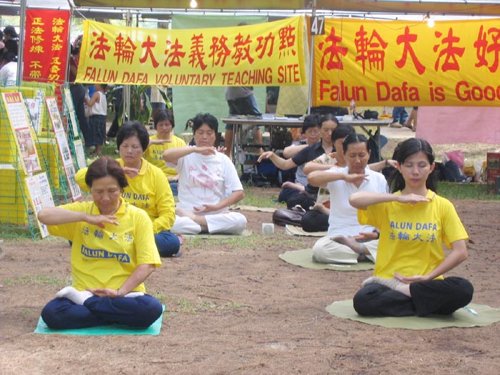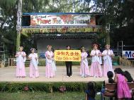 这次活动一开始就受到了干扰。塞班岛大法弟子临时排练舞蹈“飞旋的法轮”。我们申请上舞台表演,起先主持人不同意,台湾和塞班岛大法弟子轮流在舞台前一直坚持用手拉着一条上书中英文“法轮大法好”的横幅向舞台前的观众展示。在拉横幅的过程中有些中国同胞看到“大法好”的横幅很惊讶。