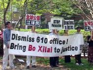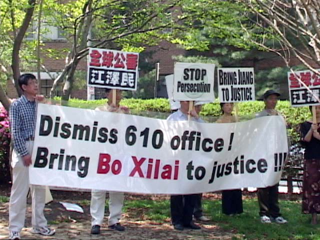 数十名华府地区法轮功学员和当地民众参加集会,打着“立即驱逐人权恶棍薄熙来”,“全球公审江泽民”,“法轮大法好”,以及英文“中国停止迫害法轮功”、“解散610办公室!法办薄熙来!”等横幅。