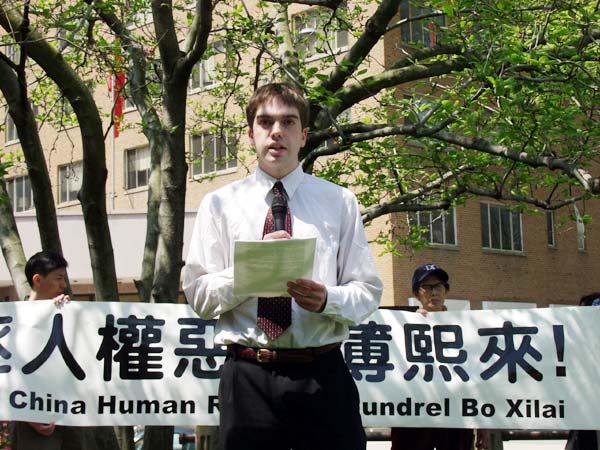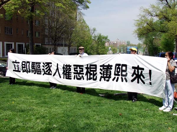 2004年4月21日中午,华府地区的法轮功学员和“追查迫害法轮功国际组织”(“追.查!国际”)、美国“法轮功之友”在中国驻美国大使馆前联合举行了新闻发布会,呼吁美国政府立即驱逐人权恶棍薄熙来。