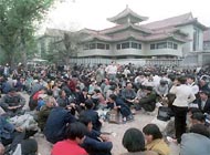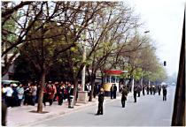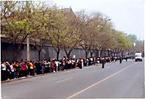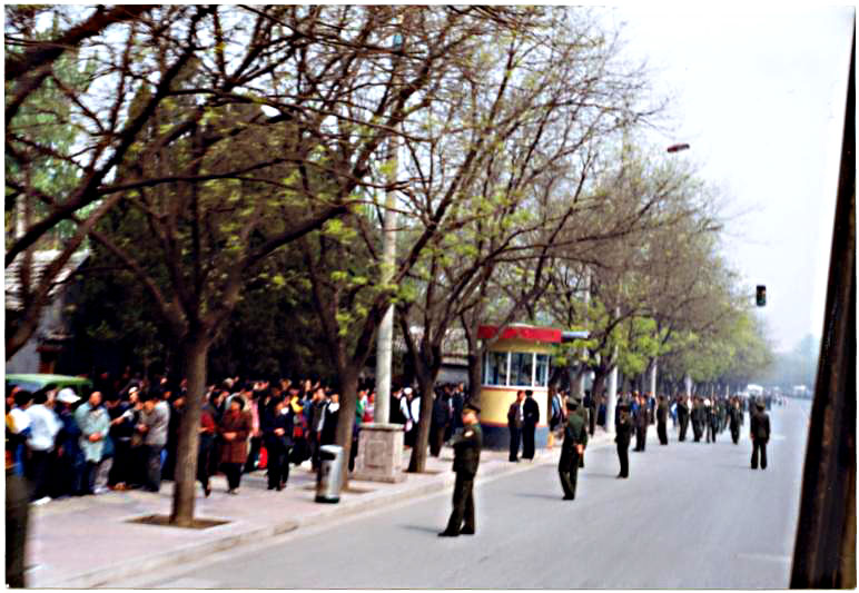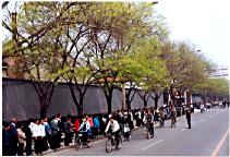 4月25日早晨,我到达府右街北口时大约七点半钟。府右街和附近的街道两边已经站了许多学员,大家或站、或坐、没有和行人交谈,有的手里捧着书在看。人虽然很多,但既没有阻塞交通,也没有喧哗声。马路上骑自行车上班的人们如往常一样地赶路。我穿过西安门大街,进到南边的城区。小区里也有许多人,公厕旁边等着上厕所的人排着十多米的队伍,秩序井然。我是第一次来这里,连门在哪里都不知道。心想先转一圈,希望遇到认识的同修。于是顺着府右街西侧往南走。街道两边的学员排列得整整齐齐,靠外侧(马路)的学员站着,靠里的学员坐着,手里捧着《转法轮》。从他们的衣着看,有些是从农村来的,透着朴实和善良。沿途我没有见到我认识的学员,倒是随处可看到一些年轻人拿着对讲机在报告情况,衣着和普通人差不多,可能是便衣。