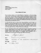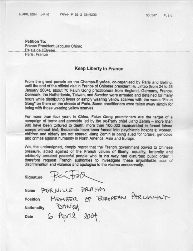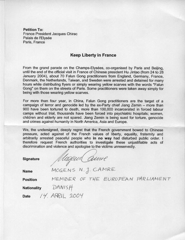 我们,以下签名者,对法国政府屈服于中国的压力、违背法国以自由-平等——博爱为基本价值的行为、随意逮捕决无可能妨碍公共秩序的和平人士而感到深深的遗憾。 因此,我请求法国当局对这一具有歧视性并带有暴力的不公正行为的事件展开调查,并无保留的向受害者道歉。