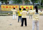 学员在游行前炼功 |  法轮功学员发表声明文 |