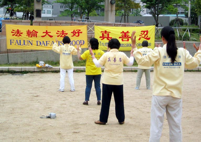 游行队列穿过了大阪市政府和律师聚集的繁华街区,正值中午,公务员们在街上看到了游行队伍,纷纷驻足观看,并接过传单,有的还向发传单的学员询问起诉江泽民一事。游行到大阪总领事馆后结束,学员们又来到领馆前继续发正念,纪念“四二五”五周年。