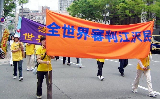 为了纪念“四二五”五周年同时向日本社会呼吁起诉镇压法轮功的元凶江泽民,日本近畿法轮功学员在大阪市举行了游行和到中国领事馆发正念活动。