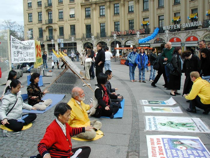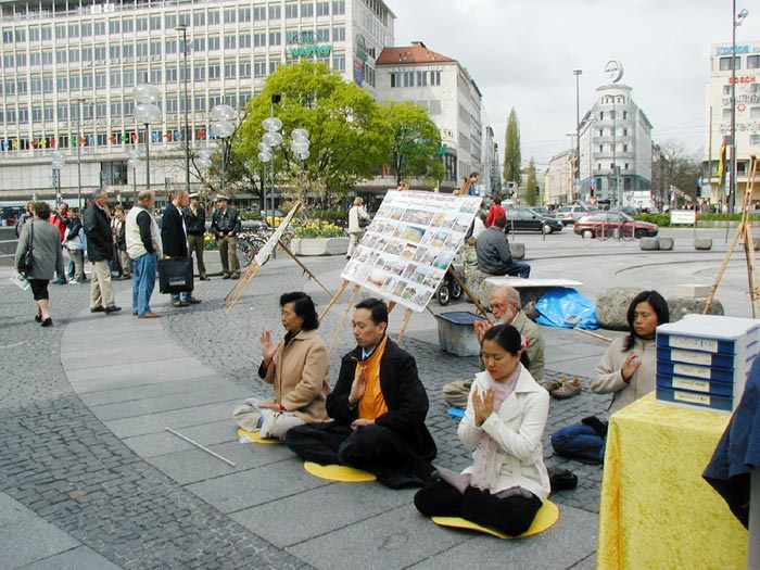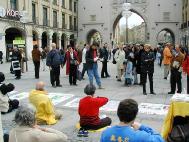 24日慕尼黑的聚会,不仅为了纪念425五周年,大家还挂起《法办江××、罗干、刘京、周永康》横幅,在信息台上摆着《把江××送上审判台》的征签表,信息台前,摆放着一个大牌子,上面用德语写道:“请给法轮功学员与道义上的支持,请在《把江××送上审判台》的征签表上签名。”当大家刚刚开始搭展台的时候,就有不少人前来签名,事先准备的签名表出现了不够用的现象。