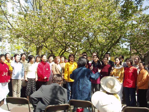 活动中穿插的两次小合唱声情并茂,内含着法轮功学员殷切善意的“为你而来”“法轮大法好”在唐人街的大街小巷回荡,许多路人驻足观看和聆听。