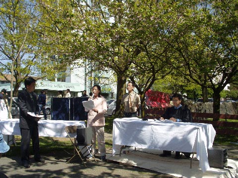 4月25日,温哥华熙熙攘攘的唐人街显得分外热闹。纪念横幅、展板把唐人街的街边公园布置得很醒目,学员们分别用国语、粤语以及英语向民众报告1999年4.25上访真象。当年在北京参加4.25上访的李女士、魏先生分别上台讲了他们的亲身经历,以及警察如何带领上访学员站到中南海周围的具体过程,用事实揭露江氏集团所谓“围攻”“包围”的谎言及阴谋陷害。