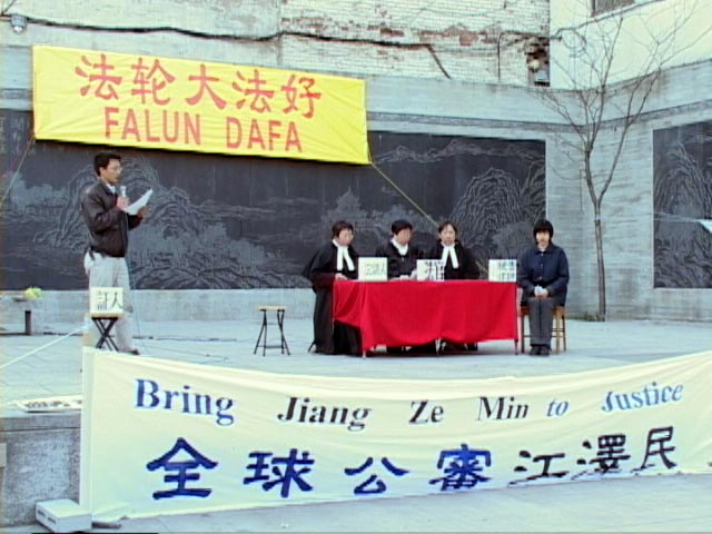 下午4点至5点,模拟法庭公审了邪恶之首江泽民。除了公诉人陈述邪恶之首犯下“反人类”、“酷刑”和“群体灭绝”等罪行之外,还有4名当事人出庭作证,提供了上访学员单纯诉求修炼自由的事实和公安制造“围攻中南海”假象的证据,表明4.25事件是江泽民个人蓄意镇压法轮功的必然。