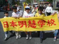 当游行队伍通过繁华的闹市区时,过往的人们震惊了!一幅幅触目惊心的图片引起人们的注目,人们不断的从学员手里接过真象资料,马上看了起来;有的马上掏出相机把这场面拍下来。有一位中国人看见游行队伍后给震住了,等缓过神来时,象是还没看清楚就又追到队伍的前方站那目不转睛的看那一幅幅受迫害的图片。有位法轮功学员说,游行中好几位日本人因没看清图片,队伍就过去了,硬是让学员给他看清楚他身上穿的SOS衣服上写的是什么。还有一位市民人权协会的人士说,她看到队伍里打的横幅是有关起诉江××的,她说很想了解更多的情况。她还说法轮功的这种活动越多越好,人们都了解迫害的真象了,江××对法轮功的迫害就进行不下去了。
