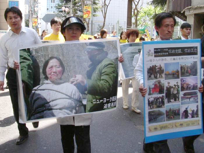 4月24日下午,大纽约地区大法弟子在中领馆前集会,展示4.25上访的历史和法轮功在5年中遭受的迫害。同时模拟审判江××,呼吁各界人士制止迫害。