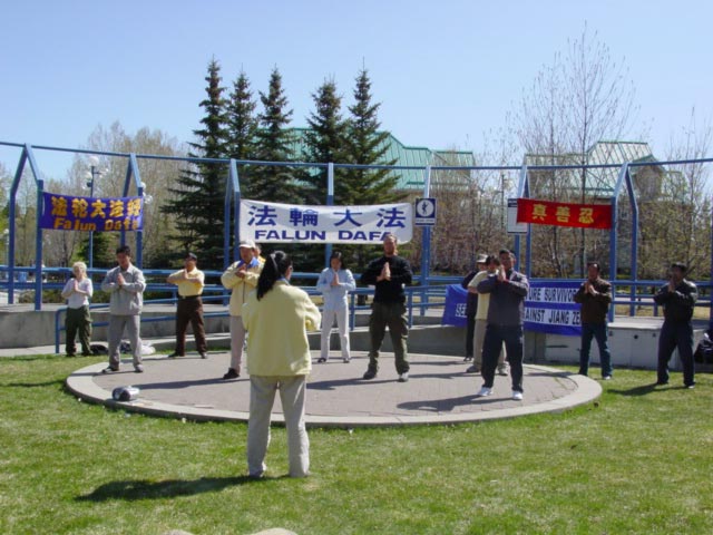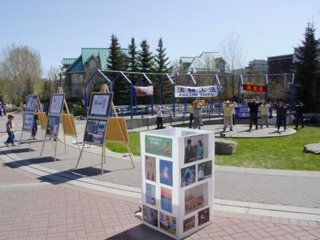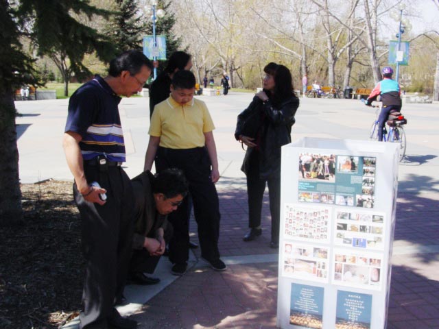 悠扬的炼功音乐和学员们舒缓的炼功动作,吸引着过往行人驻足观看;真象资料和展板使人们更加明白了江氏集团残酷迫害法轮功的行径。