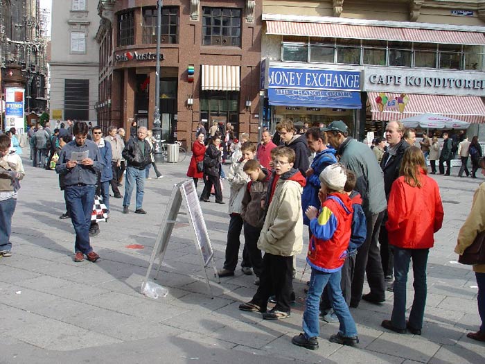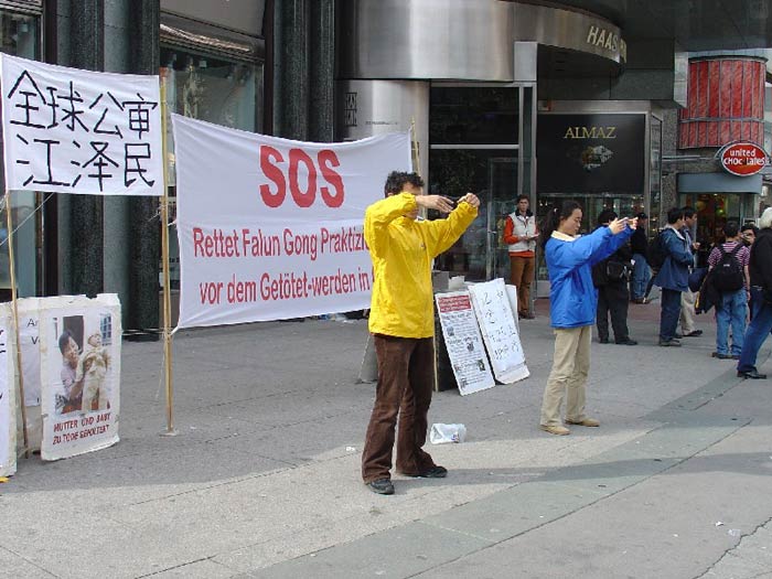 【明慧网2004年4月29日】2004年4月24日奥地利大法弟子在维也纳市中心的著名旅游景点史帝文广场,举行了为纪念和平请愿5周年的洪法活动,向世人展示法轮大法的美好,并揭露江氏集团对法轮功学员将近5年的镇压与。