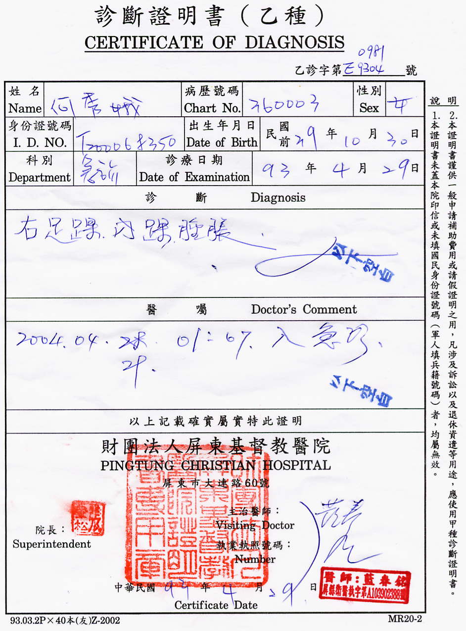 何女士回家后除了全身疼痛外,右脚红肿有两个针孔,故到医院检查验伤。