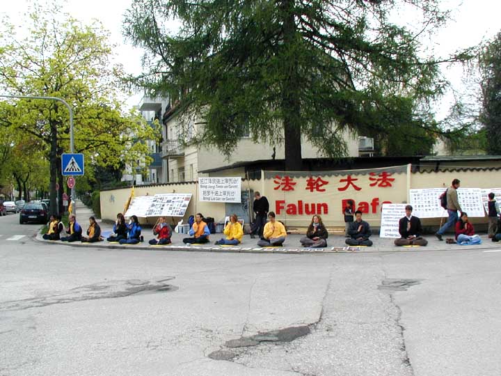 【明慧网2004年4月30日】2004年4月25日,来自德国南部地区的法轮功学员在慕尼黑中领馆前聚会,纪念4.25五周年,同时打出“把江泽民送上审判台”的横幅。