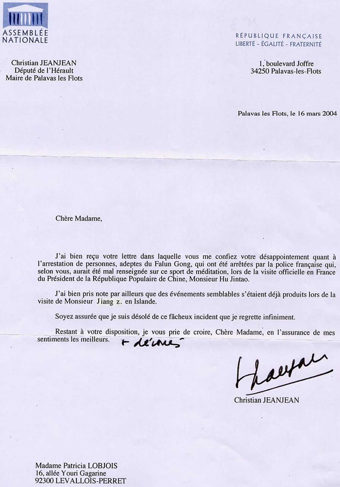 克里斯蒂安·让让首先在她的信中说“对这种令人恼火的事件表示遗憾并致深深的歉意”,她还提及在中国国家主席胡锦涛对法国的正式访问期间有人向这些警察提供的有关法轮功的情况是不准确的。