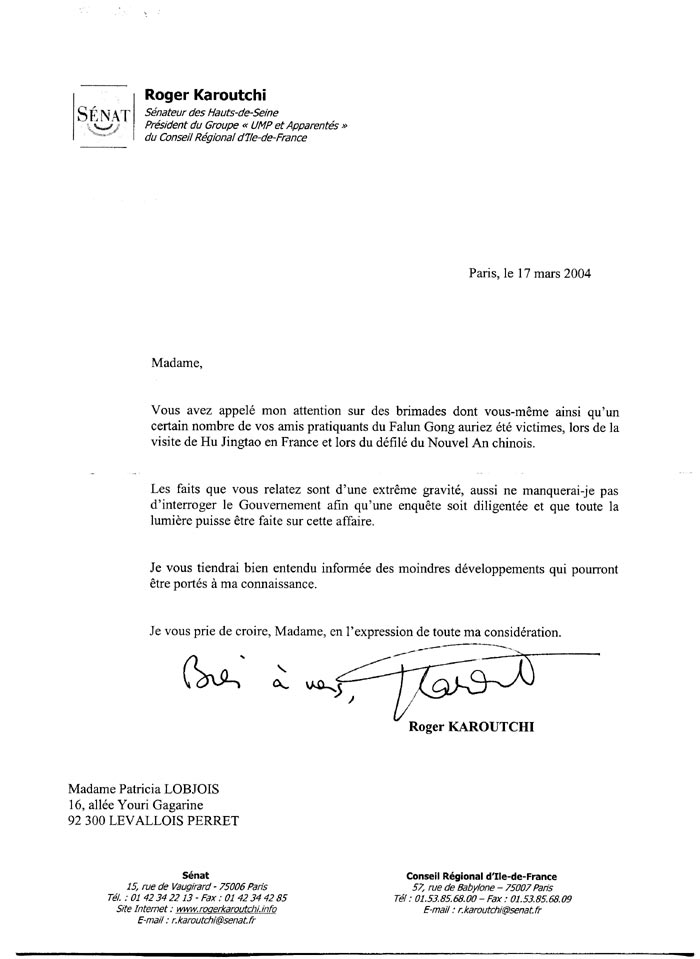罗歇·卡卢奇在来信中称“您(法轮功学员)所叙述的事件是极其严重的,因此我一定会去询问法国政府,以便进行严谨的调查并使有关事件的真相大白于天下。”并表示将及时告知有关此事的任何进展情况。