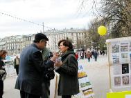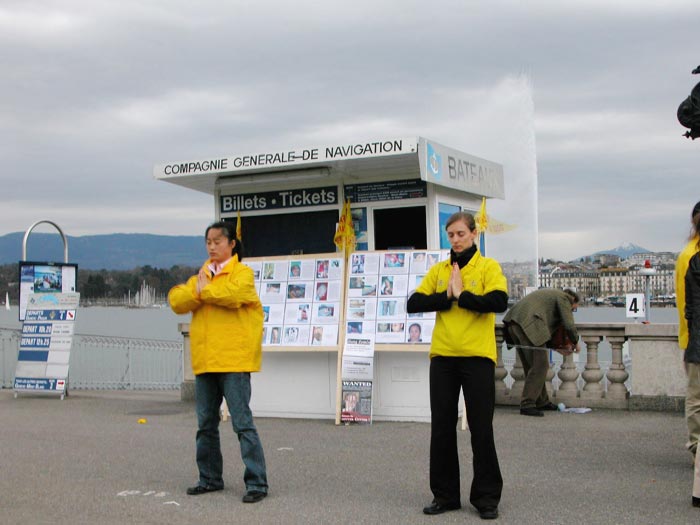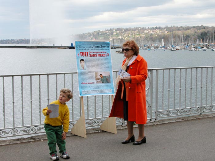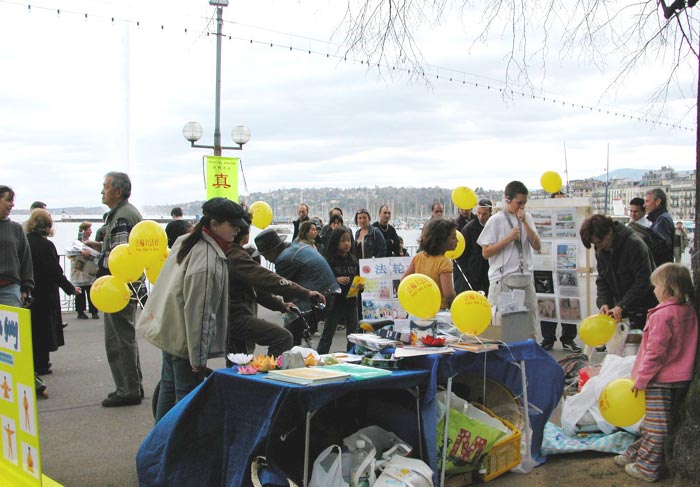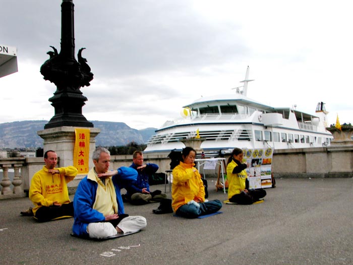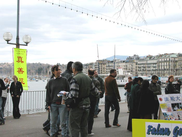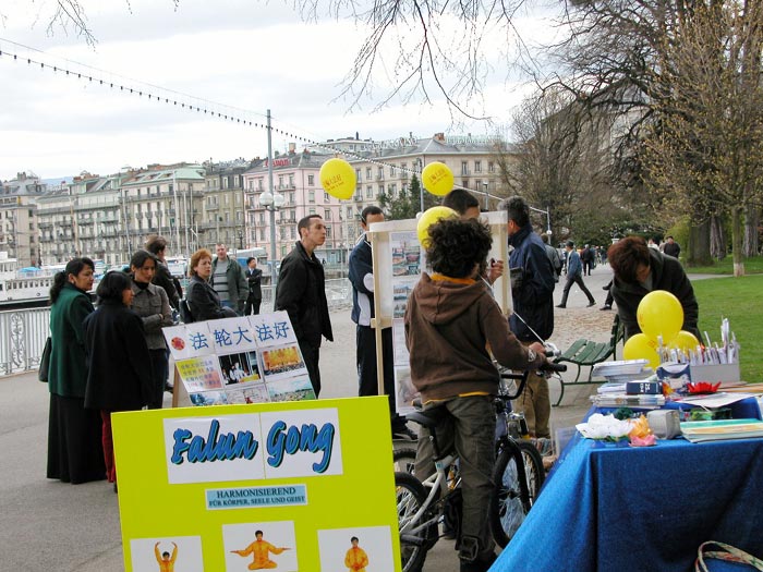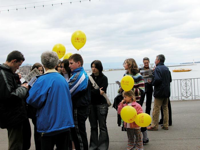 【明慧网2004年4月9日】在联合国人权会议期间,欧洲的法轮功学员周末来到了日内瓦街头向人们讲诉在中国发生的