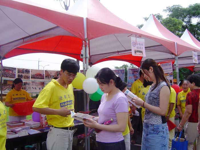 9日适逢母亲节,天气晴朗,许多人阖家出游,这一盛会也给学员们提供了向广大民众讲清法轮功真象的机会。五结乡的林小姐带着一对念小学却已修炼法轮功多年的儿女参加此活动,她表示小朋友学炼之后都能以《转法轮》书中要求的提高心性勉励自己,敦品励学,在校成绩名列前茅,多次当选模范学生。