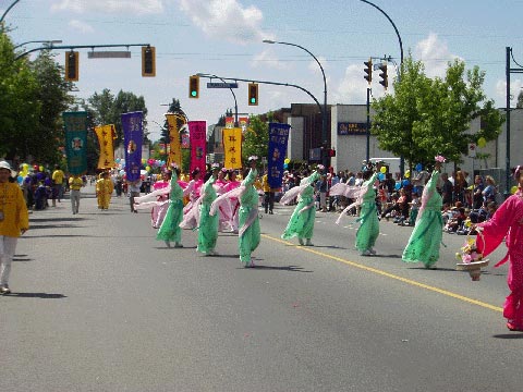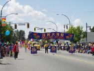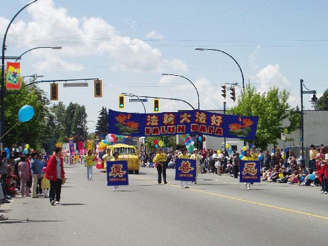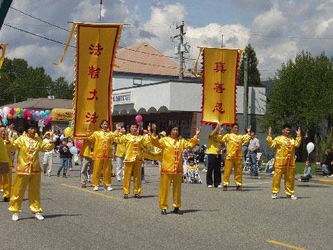 【明慧网2004年5月10日】大温哥华地区法轮功学员2004年5月8日参加了高贵林市的五月节游行,这是法轮功学员连续四年参加该市的游行。