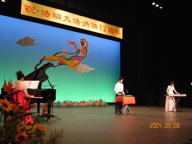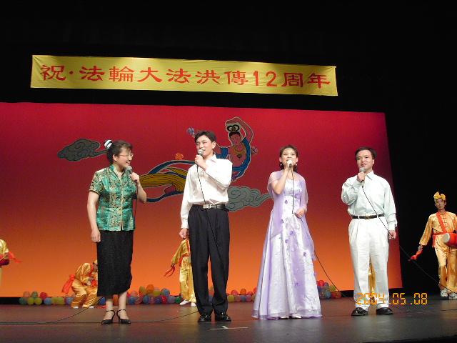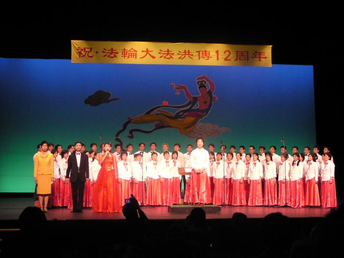 两个多小时的音乐会,在台上演员和台下不少热情的观众共同高唱「法轮大法好」的歌声中圆满结束。其间主持人分别宣读了由日本国会议员牧野圣修、大前繁雄和服部三男雄先生特意为音乐会发来的贺词。